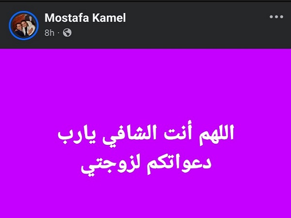 وكتب مصطفى كامل عبر حسابه الرسمي على موقع التواصل الاجتماعي "فيسبوك": "اللهم أنت الشافي، يا رب دعواتكم لزوجتي".