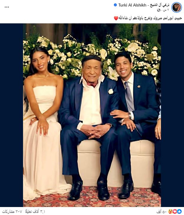ونشر تركي آل شيخ صورة للنجم عادل إمام من حفل كتب الكتاب عبر صفحته الرسمية "فيس بوك" وعلق عليها "حبيبي ابو رامي مبروك وتفرح باولادهم ان شاء الله".