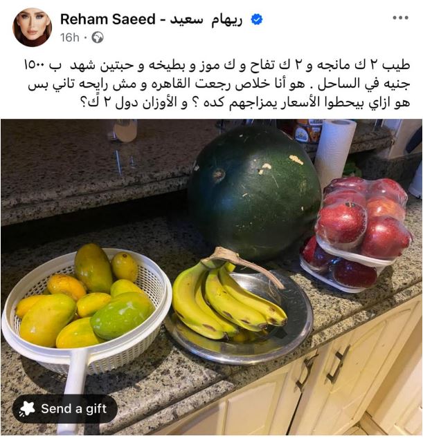 عبرت الإعلامية ريهام سعيد عن استيائها الشديد بسبب الأسعار المرتفعة والغير منطقية بالساحل الشمالي وذلك بعد شرائها فاكهة ب1500 جنيه في مقابل أوزان خفيفة مما أثار استيائها .