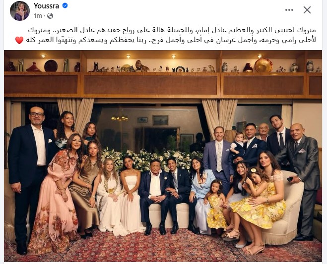 وكتبت عبر حسابها الرسمي على موقع التواصل الاجتماعي لتبادل الصور والفيديوهات الانستجرام: “مبروك لحبيبي الكبير والعظيم عادل إمام، وللجميلة هالة على زواج حفيدهم عادل الصغير.. ومبروك لأحلى رامي وحرمه، وأجمل عرسان في أحلى وأجمل فرح.. ربنا يحفظكم ويسعدكم وتتهنّوا العمر كله”.
