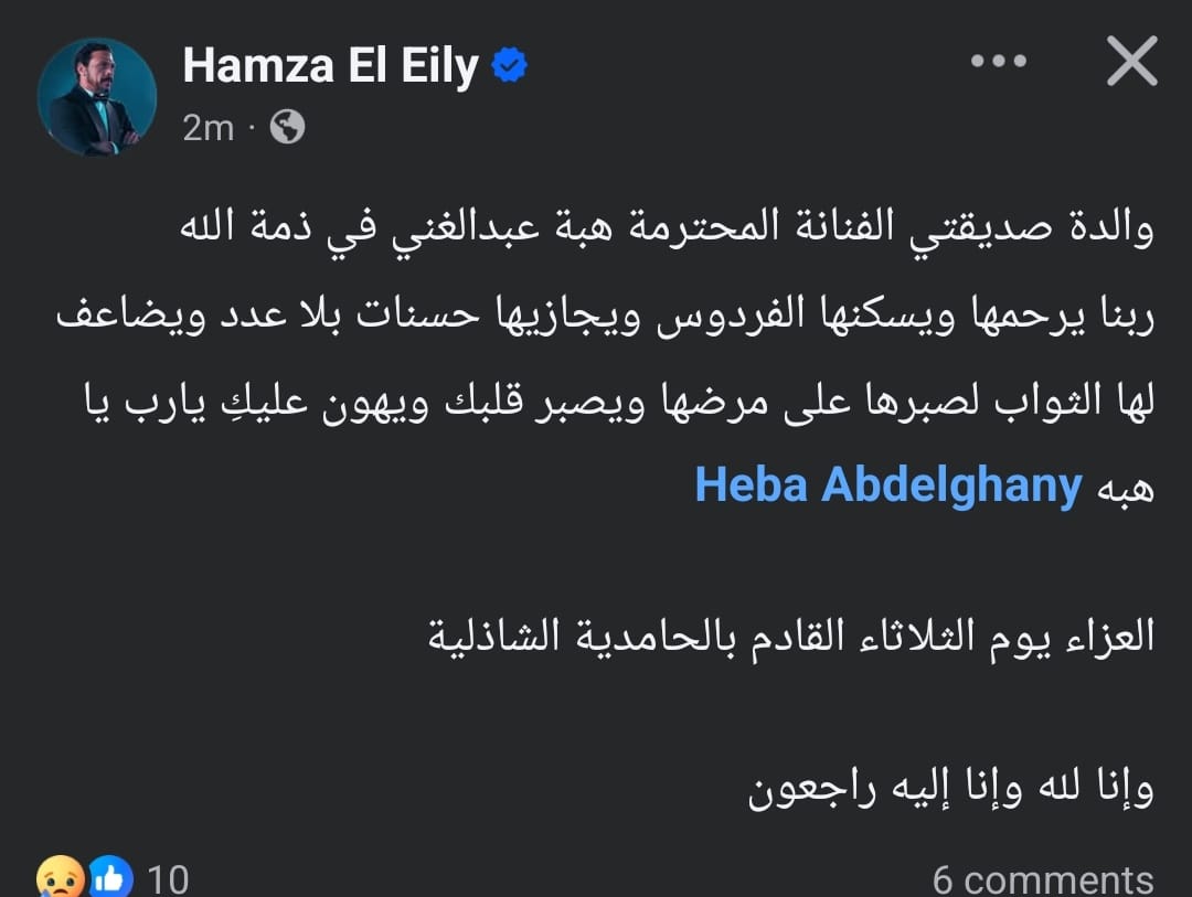 نعى الفنان حمزة العيلي، الفنانة هبة عبد الغني في وفاة والدتها، التي رحلت عن عالمنا اليوم الأحد منذ قليل، كاشفا عن موعد العزاء.