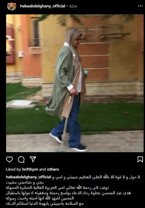 وكتبت هبة عبد الغني عبر صفحتها الرسمية في موقع التواصل الاجتماعي إنستجرام: لا حول و لا قوة الا بالله العلي العظيم حبيبتي و امي و بنتي و صاحبتي مشيت، توفت الي رحمة الله تعالي امي العزيزة العالية الصابره الحمولة، هدي عبد المحسن عطوة رجاء الدعاء بواسع رحمته ومغفرته ادعولها باستقبال المحبين اشهد الله انها احبته واحبت رسوله، مع السلامه ياحبيبتي يابهجة الدنيا استلكم الدعاء.