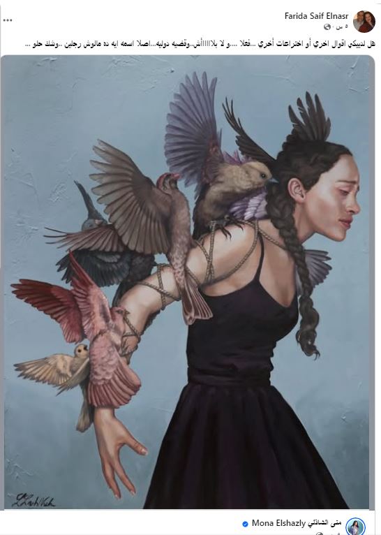 وكتبت سيف النصر عبر صفحتها بعدما اعادت منشور للإعلامية مني الشاذلي الذي أكدت فيه أن اللوحة المعروضة في برنامجها "معكم" هي من أعمال الفنانة الدنماركية "Lisa Lach-Nielsen"، وليس من رسم مها الصغير قائلة "هل لديكي اقوال اخري أو اختراعات أخرى ...فعلا ....ولا بلااااااش..وقضيه دوليه...اصلا اسمه ايه ده مالوش رجلين ..وشك حلو ".
