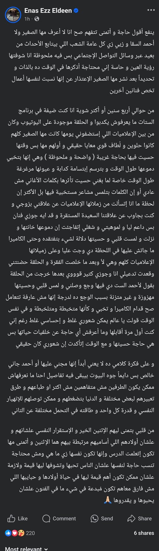وأشارت إلى: “وعلى فكرة كلامي ده لا يعني أبداً إنها مجني عليها أو أحمد جاني خالص بس دايماً جوه البيوت بيبقى فيه تفاصيل احنا ما نعرفهاش ممكن يكون الطرفين مش متفاهمين مش اكتر او طباعهم و طرق تعبيرهم لبعض مختلفة و الدنيا بتضغطهم و ممكن توصلهم للإنهيار النفسي و قدرة كل واحد و طاقته في التحمل مختلفة عن التاني”.