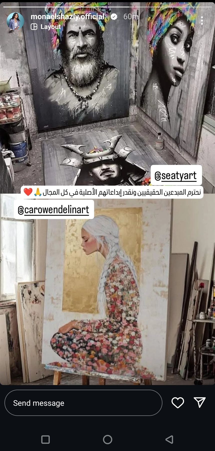 نشرت الإعلامية منى الشاذلي صورتين لأعمال فنية الفنانتين عبر خاصية الاستوري على موقع التواصل الاجتماعي لتبادل الصور والفيديوهات الانستجرام، وعلقت: “ نحترم المبدعين الحقيقيين ونقدر إبداعاتهم الأصلية في كل المجال”.