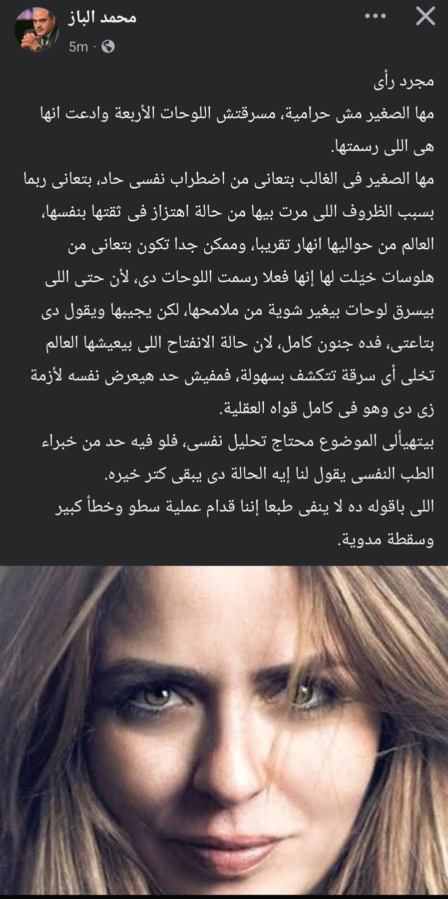 وكتب عبر حسابه الرسمي على موقع التواصل الاجتماعي الفيسبوك: “مجرد رأى، مها الصغير مش حرامية، مسرقتش اللوحات الأربعة وادعت انها هى اللى رسمتها”.