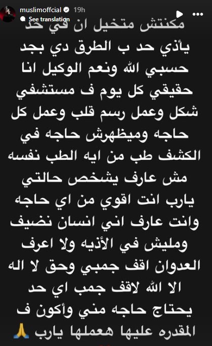 وكتب مسلم منشور عبر خاصية الاستوري على موقع التواصل الاجتماعي لتبادل الصور والفيديوهات الانستجرام: “مكنتش متخيل ان في احد، يأذي حد ب الطرق دي بجد حسبي الله ونعم الوكيل انا حقيقي كل يوم ف مستشفى شكل وعمل رسم قلب وعمل كل حاجه وميظهرش حاجه في الكشف”.