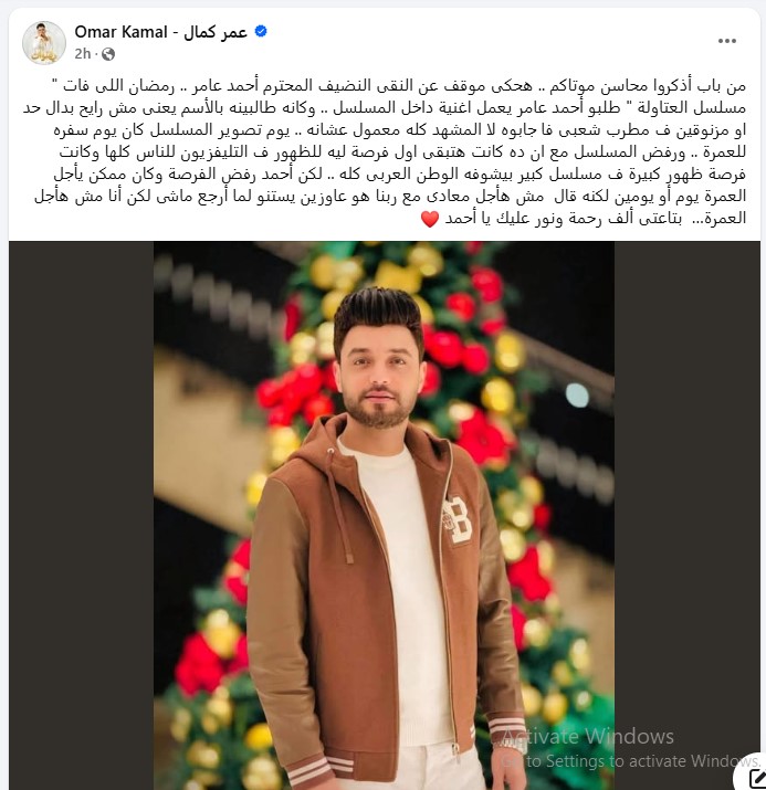 وكتب مطرب المهرجانات عمر كمال على موقع التواصل الاجتماعي الفيسبوك: "من باب أذكروا محاسن موتاكم .. هحكى موقف عن النقى النضيف المحترم أحمد عامر .. رمضان اللى فات "مسلسل العتاولة" طلبوا أحمد عامر يعمل اغنية داخل المسلسل".