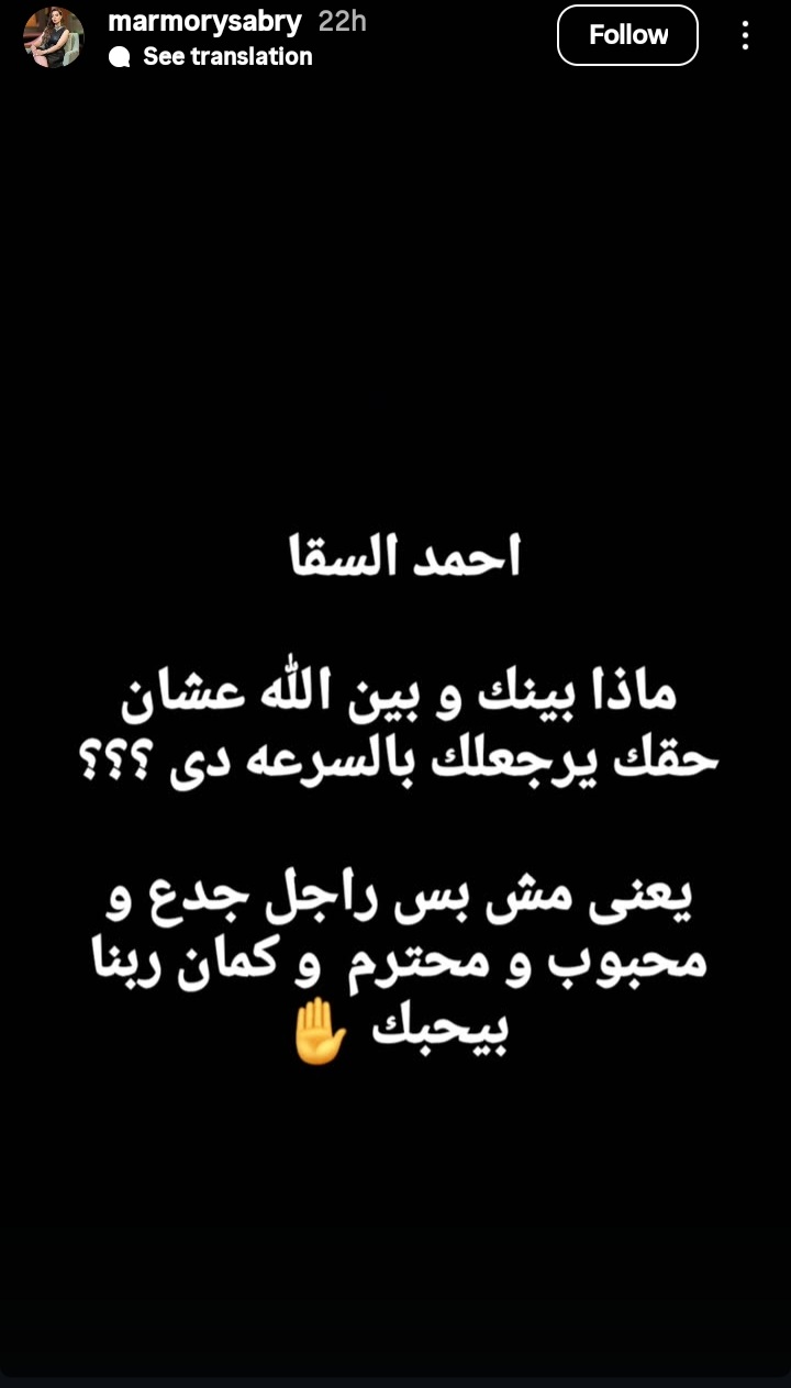 وكتبت مروة عبر خاصية الأستوري على حسابها الرسمي "إنستجرام" أحمد السقا ماذا بينك وبين الله عشان حقك يرجعلك بالسرعة دى، يعنى مش بس راجل جدع و محبوب و محترم وكمان ربنا بيحبك”.