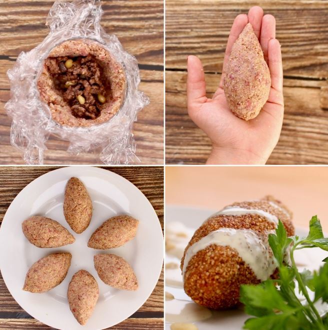 تحشى الكبة بحوالي ملعقة كبيرة من حشوة اللحم، تغلق من الأعلى باستخدام كلتا اليدين تكور .