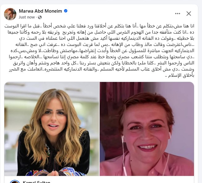وتابعت: “وقولت ده الفنانة الدنماركية نفسها أكيد مش هتعمل اللي احنا عملناه في الست دي، ناس اعترضت وقالت ما لذ وطاب من الإهانة، بس لما قريت البوست ده، عرفت اني صح”.