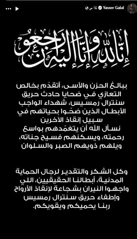ونعي ياسر جلال من خلال خاصية الاستوري الضحايا قائلا " أتقدم بخالص التعازي في ضحايا حادث حريق سنترال رمسيس ، شهداء الواجب الأبطال الذين ضحوا بحياتهم في سبيل إنقاذ الآخرين .