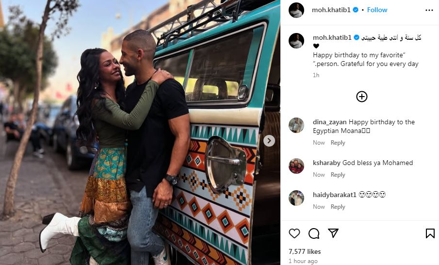 حرص محمد الخطيب زوج الفنانة أسماء أبو اليزيد على تهنئتها بمناسبة عيد ميلادها حيث نشر مجموعة من الصور الرومانسية التي تجمعهما من خلال صفحته الرسمية "إنستجرام" مرفقة برسالة تهنئة كتب فيها "كل سنة و انتى طيبة حبيبتى ، عيد ميلاد سعيد إلى شخصي المفضل… ممتن لك كل يوم".