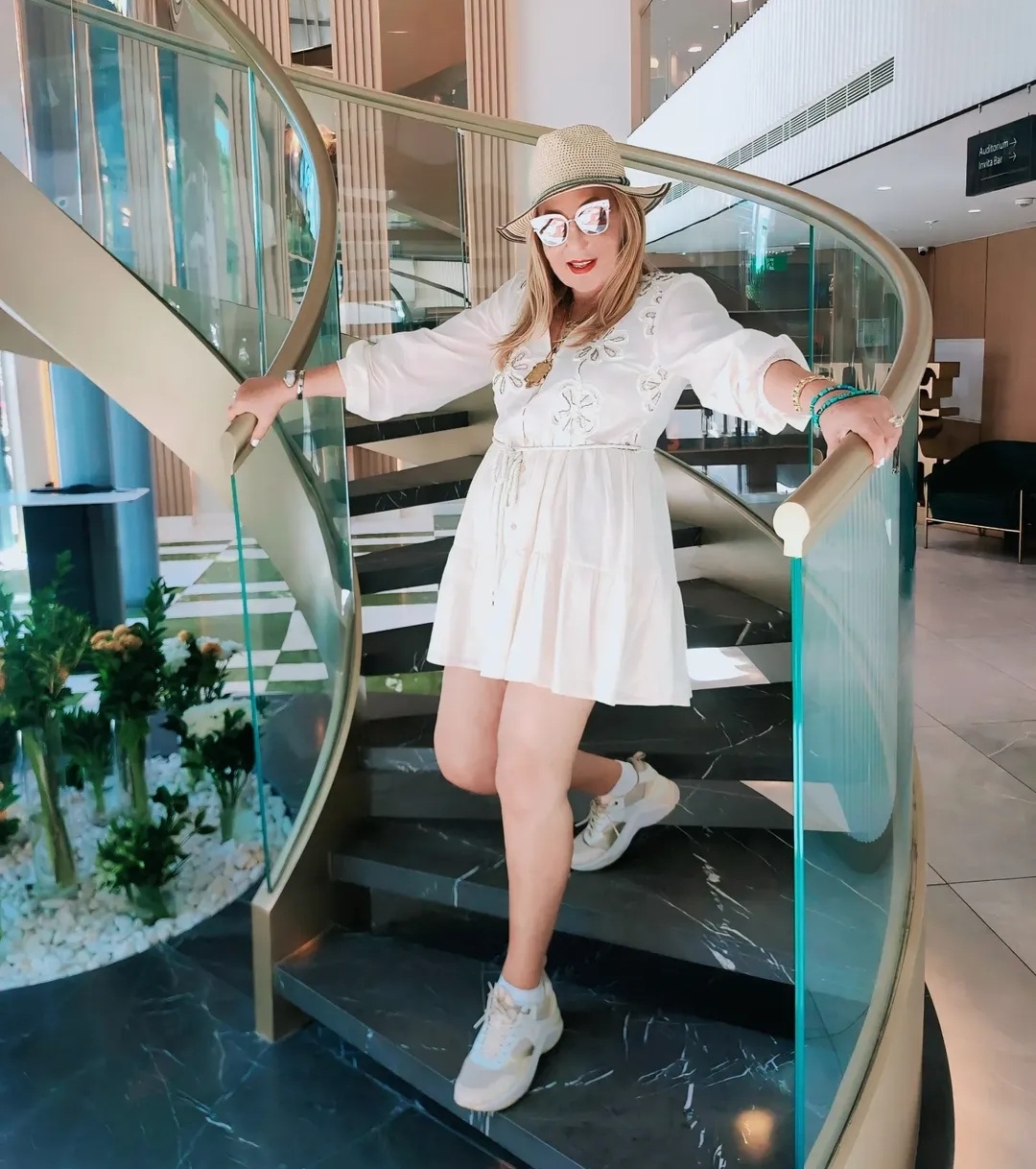 وتألقت نادية الجندي بفستان أبيض قصير، وحذاء رياضي أبيض، وطلاء للاظافر يحمل نفس اللون، وسبحة زرقاء ملتفه حول معصم يدها، ونظارة شمسيه، وطاقية فوق الراس صيفية.