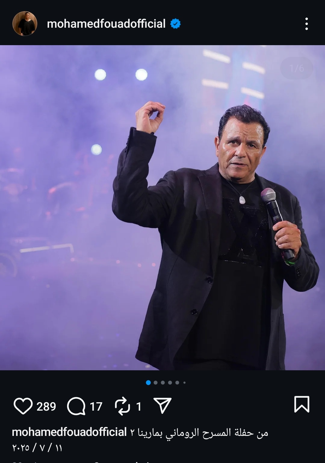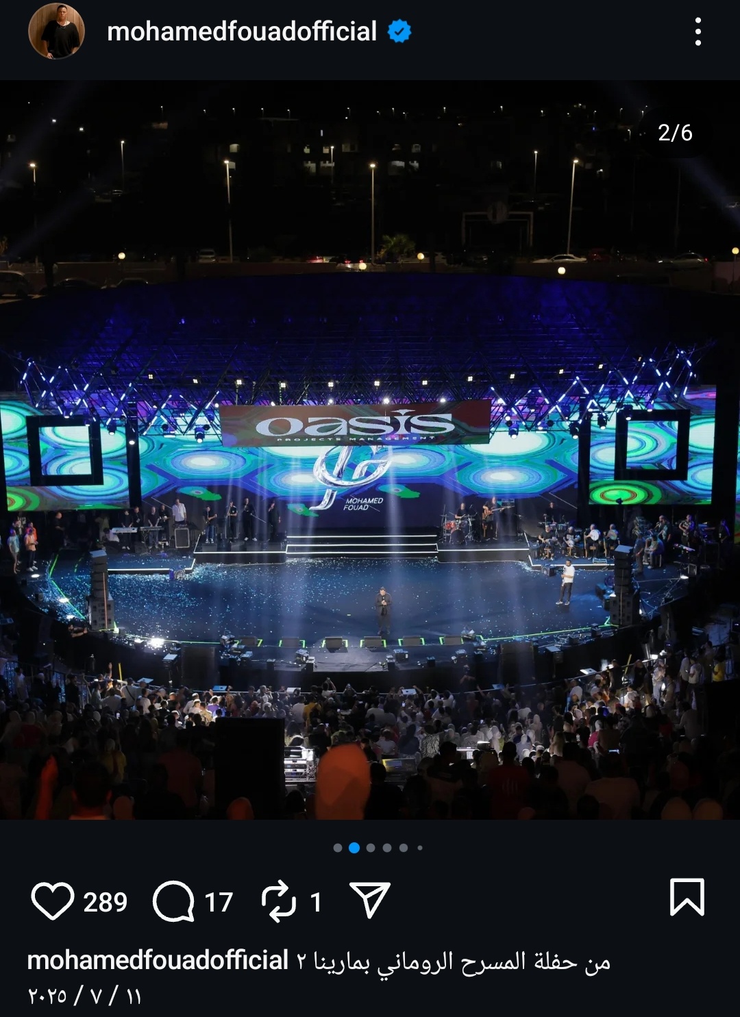 وكتب فؤاد عبر حسابه الرسمي على موقع التواصل الاجتماعي لتبادل الصور والفيديوهات الانستجرام: من حفل المسرح الروماني بمارينا 11/ 2025/7.