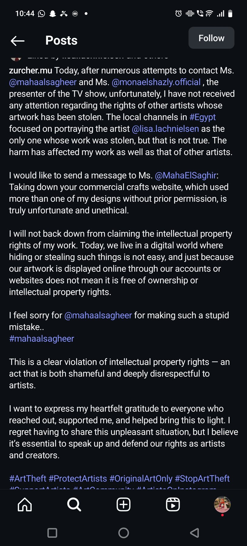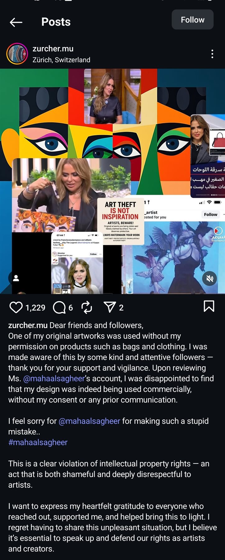 وكتبت زرشر عبر حسابها الرسمي على موقع التواصل الاجتماعي لتبادل الصور والفيديوهات الانستجرام: “اليوم، وبعد محاولات عديدة للتواصل مع السيدة @mahaalsagheer والسيدة @monaelshazly.official، مقدمة البرنامج، لم أتلقَّ للأسف أي اهتمام بحقوق الفنانين الآخرين الذين سُرقت أعمالهم الفنية. ركزت القنوات المحلية في مصر على تصوير الفنانة @lisa.lachnielsen على أنها الوحيدة التي سُرقت أعمالها، وهذا غير صحيح. لقد أثر الضرر على أعمالي وأعمال فنانين آخرين”.