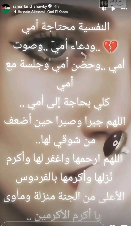 وكتبت رانيا فريد شوقي على حسابها الرسمي لتبادل الصور والفيديوهات عبر خاصية الأستوري على الانستجرام: “النفسية محتاجة أمي .. ودعاء أمي .. وصوت أمي .. وحضن أمي وجلسة مع أمي، كلي بحاجة إلى أمي .. اللهم جبرا وصبرا حين أضعفة من شوقي لها .. اللهم ارحمها واغفر لها وأكرم نزلها وأكرمها بالفردوس الأعلى من الجنة منزلة ومأوى، يا أكرم الأكرمين”.
