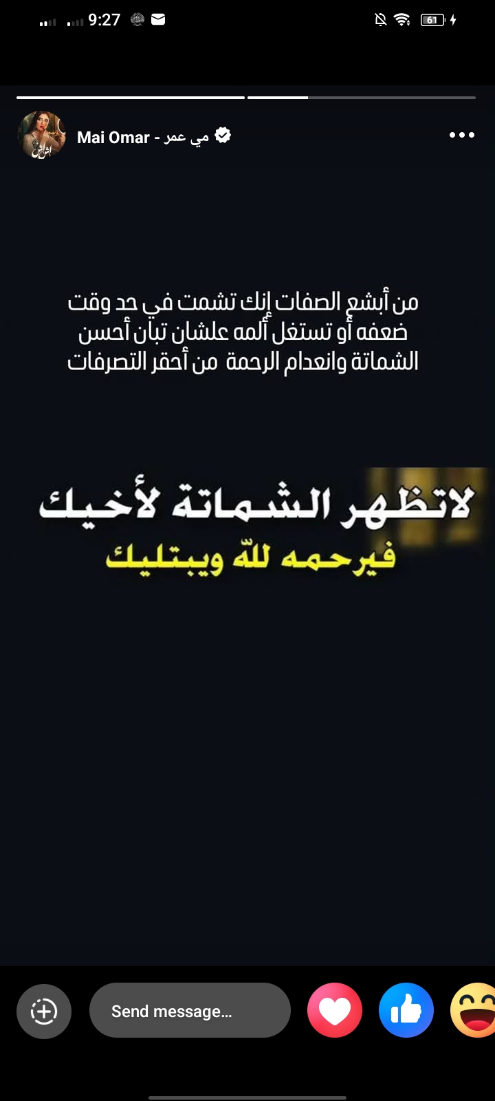 وكتبت مي عمر عبر خاصية الاستوري عبر حسابها الرسمي على موقع التواصل الاجتماعي لتبادل الصور والفيديوهات الانستجرام: “من أبشع الصفات إنك تشمت في حد وقت ضعفه أو تستغل ألمه علشان تبان أحسن الشماتة وانعدام الرحمة من أحقر التصرفات”.