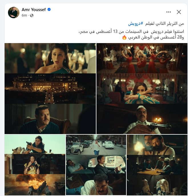 يستعد الفنان عمرو يوسف لخوض تجربة جديدة من خلال فيلمه الجديد "درويش"، المقرر طرحه في دور العرض يوم الأربعاء 13 أغسطس، على أن يعرض في باقي الدول العربية يوم الخميس 28 أغسطس.