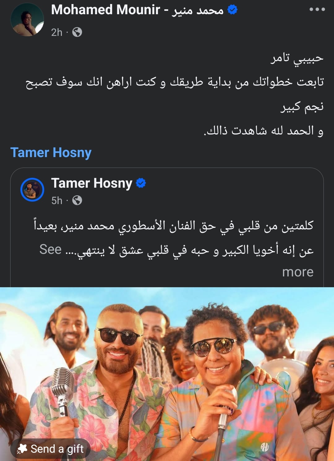 وكتب تامر حسني عبر حسابه الرسمي على موقع التواصل الاجتماعي لتبادل الصور والفيديوهات الانستجرام: “كلمتين من قلبي في حق الفنان الأسطوري محمد منير بعيداً عن إنه أخويا الكبير و حبه في قلبي عشق لا ينتهي”.