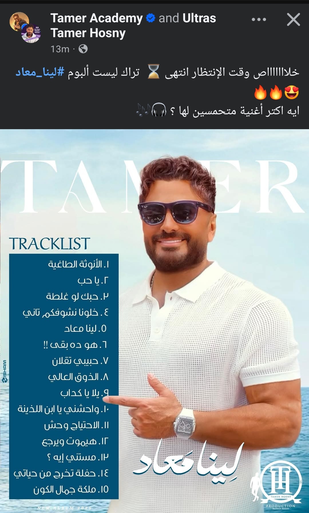وكتب عبر حسابه الرسمي على موقع التواصل الاجتماعي الفيسبوك: “خلاص وقت الانتظار انتهى، تراك ليست البوم لينا معاد، ايه اكتر أغنية متحمسين لها”