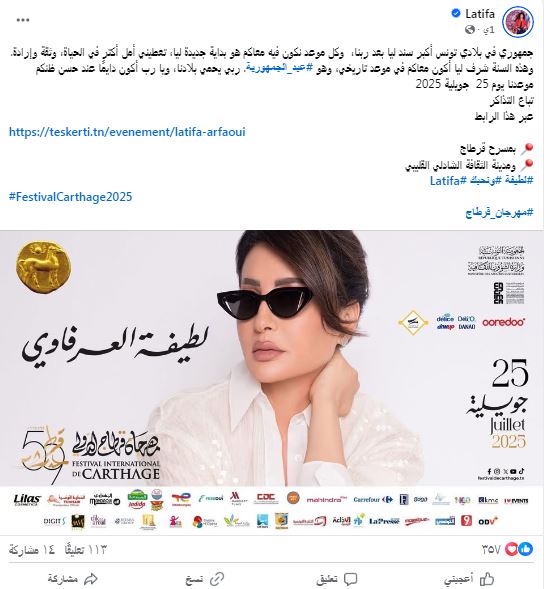 "شرف ليا اكون معاكم".. لطيفة تروج لحفلها بمهرجان قرطاج الدولي (صورة)