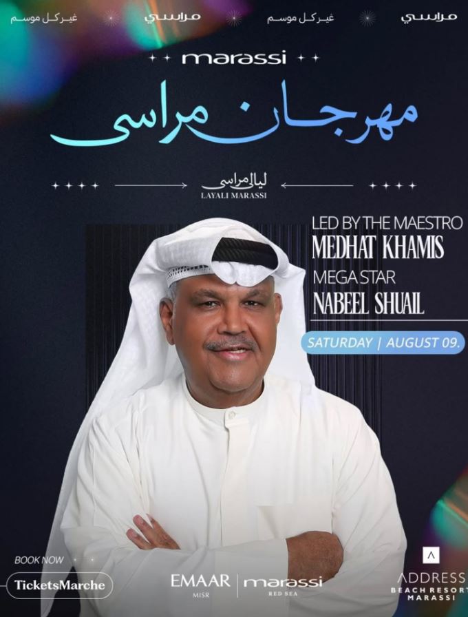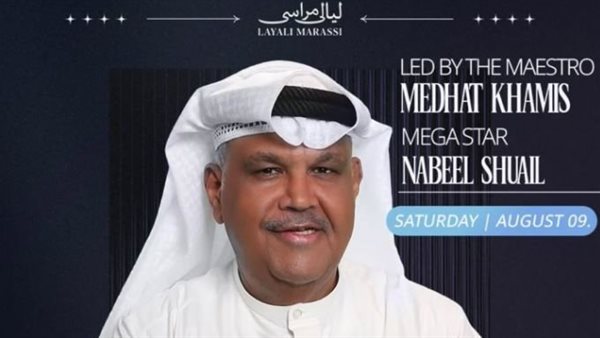 بينما يقدم المطرب الكويتي الكبير نبيل شعيل حفله يوم السبت 9 أغسطس المقبل بقيادة المايسترو مدحت خميس، والفقرة الثانية مع النجم الشعبي محمود الليثي.