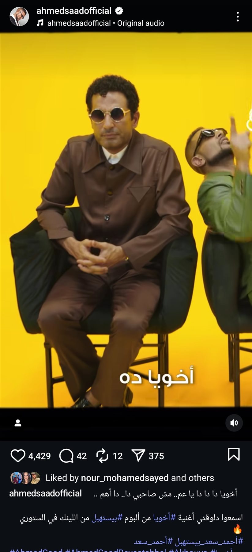 وكتب عبر حسابه الرسمي على موقع التواصل الاجتماعي لتبادل الصور والفيديوهات الانستجرام: "أخويا دا دا دا يا عم.. مش صاحبي دا.. دا أهم".