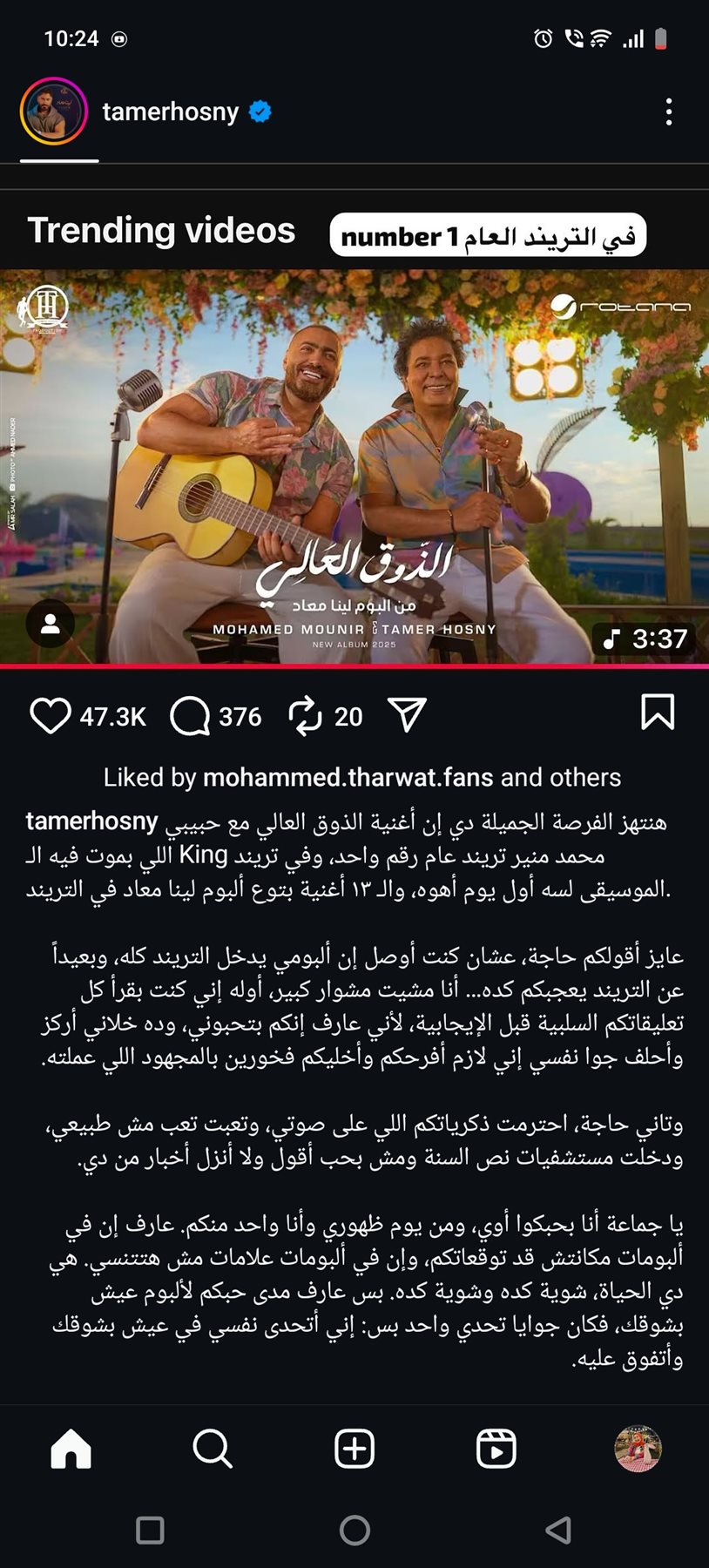 وكتب عبر حسابه الرسمي على موقع التواصل الاجتماعي لتبادل الصور والفيديوهات الانستجرام: “هنتهز الفرصة الجميلة دي إن أغنية الذوق العالي مع حبيبي محمد منير تريند عام رقم واحد، وفي تريند King اللي بموت فيه الـ الموسيقى لسه أول يوم أهوه، والـ ١٣ أغنية بتوع ألبوم لينا معاد في التريند”.