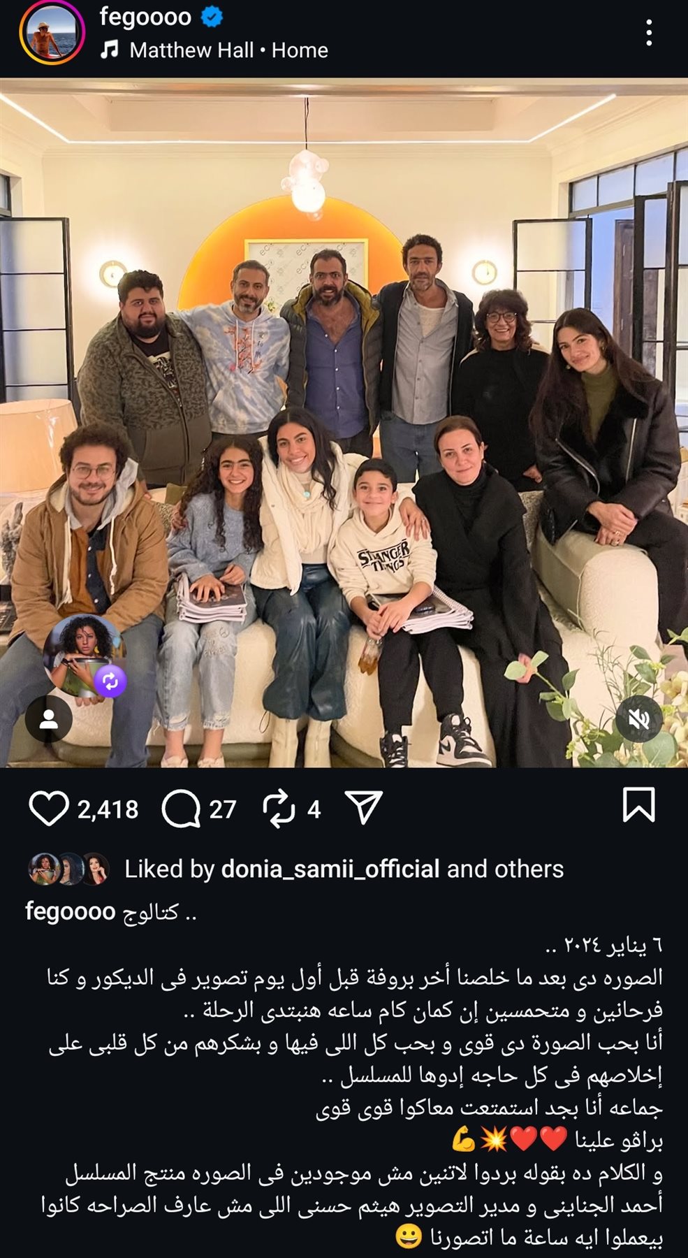 وتابع: “أنا بحب الصورة دى قوى و بحب كل اللى فيها وبشكرهم من كل قلبي على إخلاصهم في كل حاجه إدوها للمسلسل، جماعه أنا بجد استمتعت معاكوا قوی قوی، برافو علينا”.