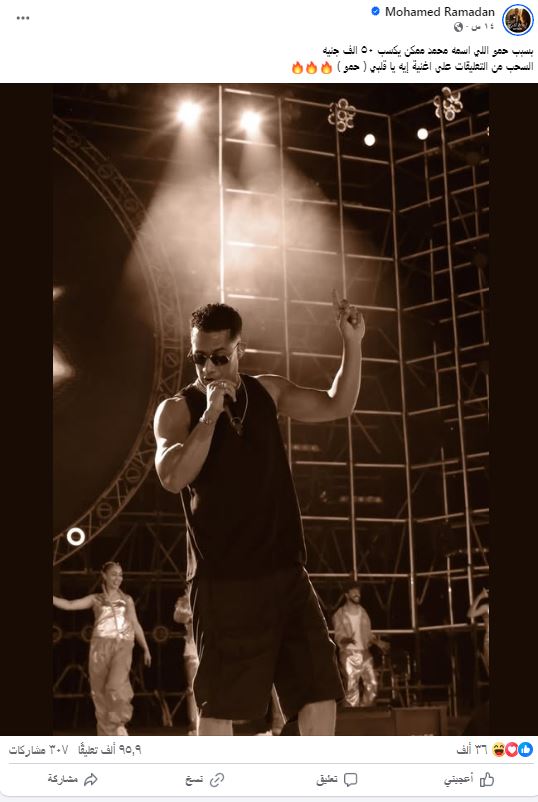 وكتب رمضان عبر صفحته الرسمية " بسبب حمو اللي اسمه محمد ممكن يكسب ٥٠ ألف جنيه ، السحب من التعليقات على أغنية إيه يا قلبي ( حمو )".