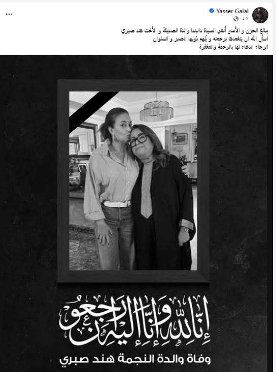 نعي الفنان ياسر جلال والدة الفنانة هند صبري والتي توفيت صباح اليوم بعد صراع مع المرض وكتب عبر صفحته الرسمية "فيس بوك" " ببالغ الحزن والأسى أنعى السيدة داليندا والدة الصديقة و الأخت هند صبري اسأل الله ان يتغمدها برحمته و يُلهم ذويها الصبر و السلوان الرجاء الدعاء لها بالرحمة والمغفرة".