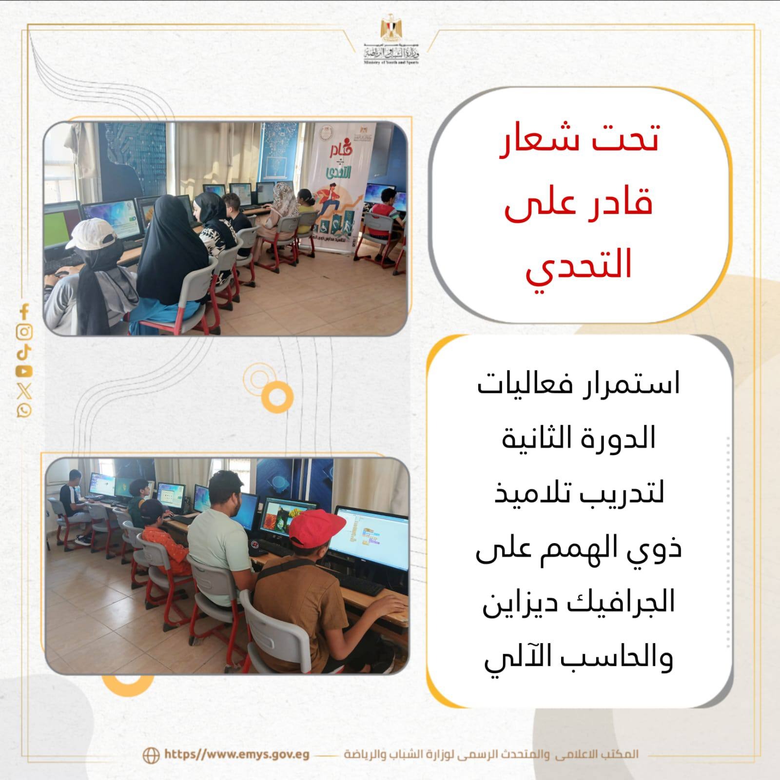 تواصل وزارة الشباب والرياضة، من خلال الإدارة المركزية لتنمية النشء ، الإدارة العامة للتنشئة المدرسية تنفيذ فعاليات الدورة الثانية لتدريب لطلاب ذوي الهمم والدمج على مهارات الجرافيك ديزاين وأساسيات الحاسب الآلي، وذلك للأسبوع الثاني على التوالي، بواقع يومين أسبوعيًا.
