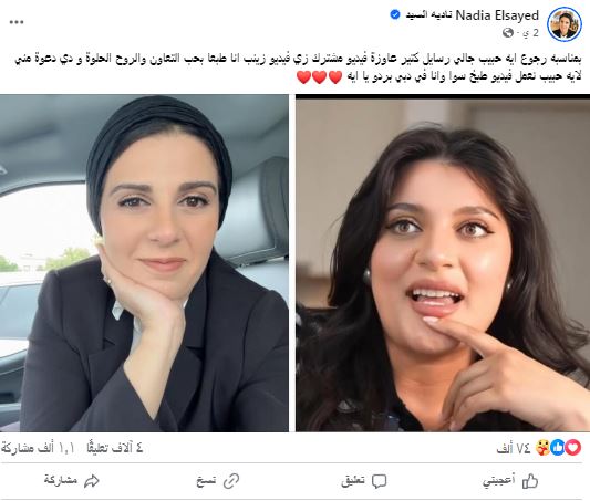 كما دعت الشيف نادية السيد دعوة للشيف آيه حبيب لتقديم فيديو مشترك حيث كتبن " بمناسبه رجوع ايه حبيب جالي رسايل كتير عاوزة فيديو مشترك زي فيديو زينب انا طبعا بحب التعاون والروح الحلوة و دي دعوة مني لايه حبيب نعمل فيديو طبخ سوا وانا في دبي بردو يا ايه".