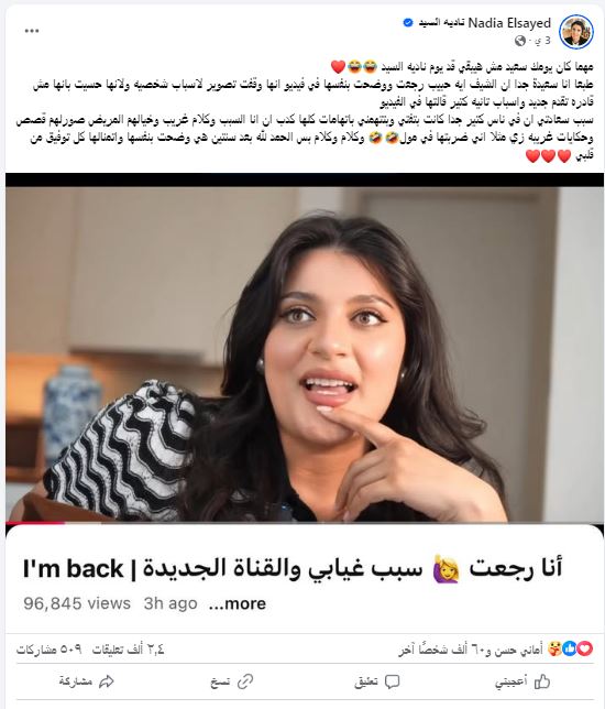وجاء إعلان العودة من خلال فيديو جديد نشرته عبر صفحتها الرسمية على مواقع التواصل الأجتماعي حيث تفاعل معه آلاف المتابعين في أول ساعات من إطلاقه وسط ترحيب كبيرة من متابعيها.
