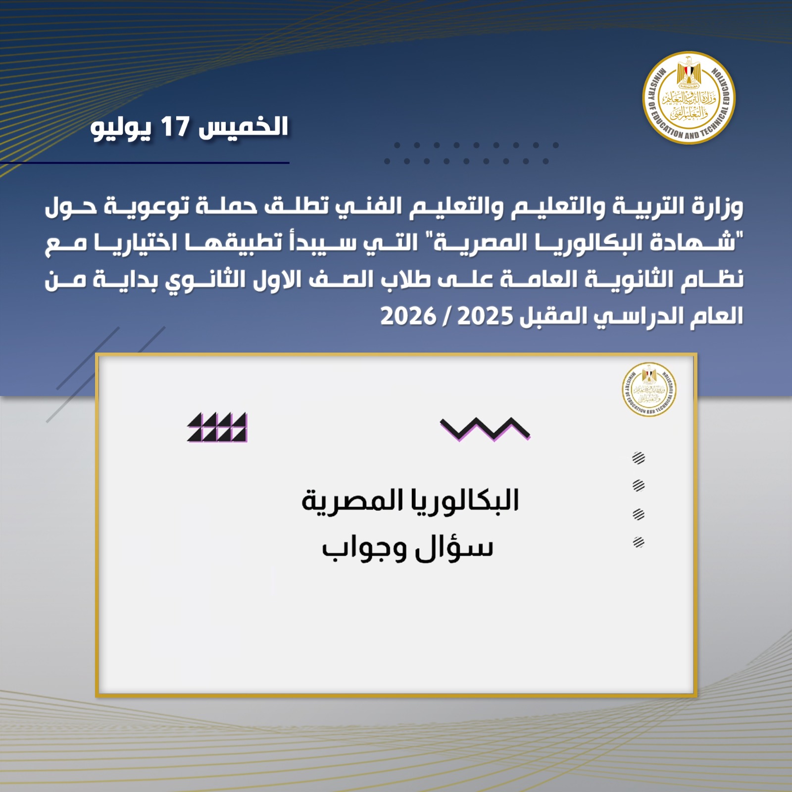 تطلق وزارة التربية والتعليم والتعليم الفني حملة توعوية حول "شهادة البكالوريا المصرية"، وفي هذا الإطار قدمت الوزارة فيديو توضيحي مبسط حول أبرز ملامح المنظومة التي سيبدأ تطبيقها اختياريا مع نظام الثانوية العامة على طلاب الصف الأول الثانوي بداية من العام الدراسي المقبل ٢٠٢٥ / ٢٠٢٦.