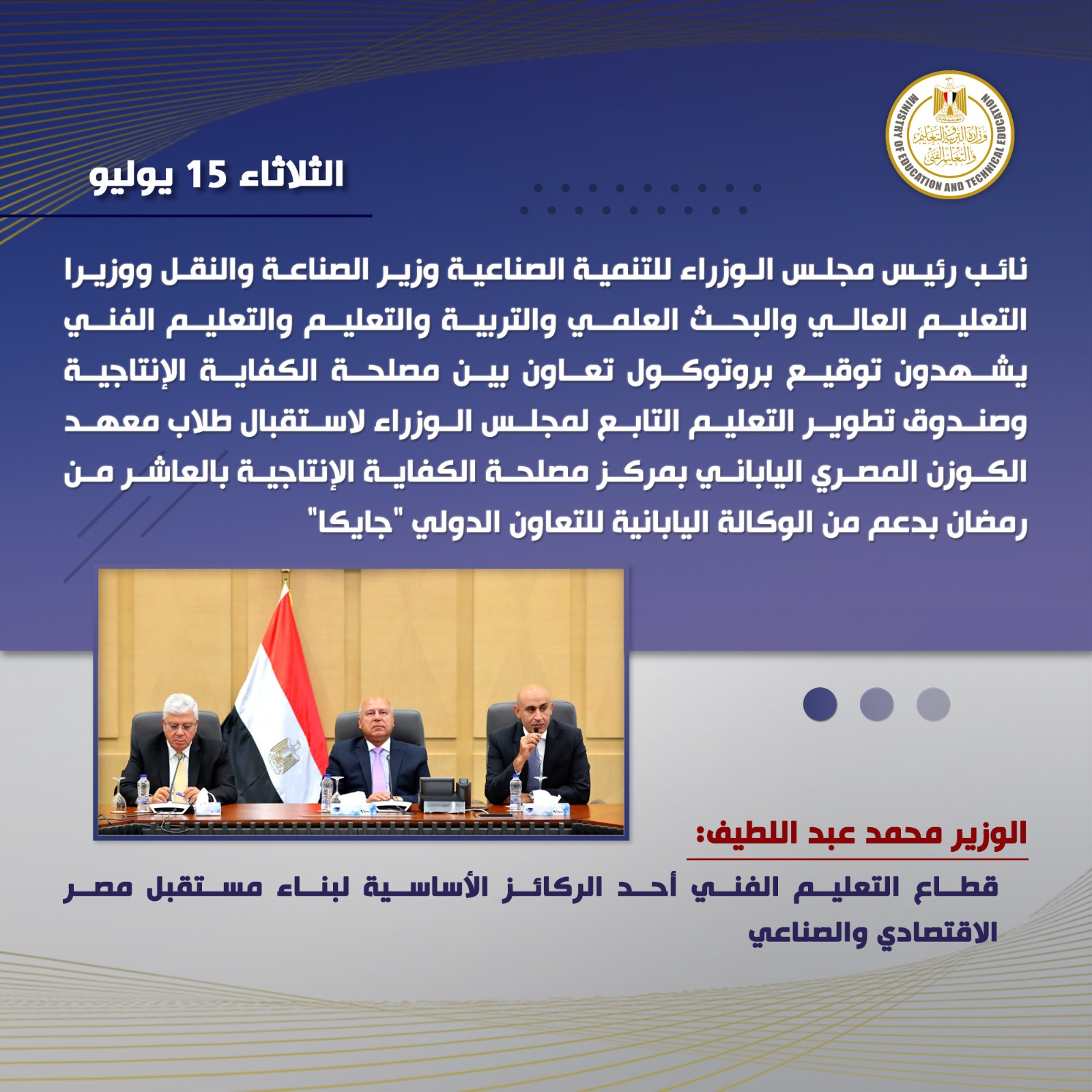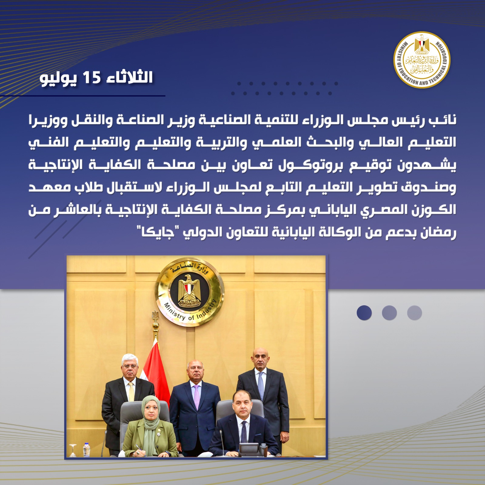 شهد الفريق مهندس كامل الوزير نائب رئيس مجلس الوزراء للتنمية الصناعية وزير الصناعة والنقل والدكتور أيمن عاشور وزير التعليم العالي والبحث العلمي، والسيد/ محمد عبد اللطيف وزير التربية والتعليم والتعليم الفني توقيع بروتوكول تعاون مشترك بين مصلحة الكفاية الإنتاجية والتدريب المهني وصندوق تطوير التعليم التابع لمجلس الوزراء بدعم من الوكالة اليابانية للتعاون الدولي "جايكا"، وذلك بهدف دعم تطوير التعليم الهندسي والتكنولوجي في مصر، وتوفير كوادر فنية مدربة و مؤهلة وقادرة على تلبية احتياجات سوق العمل المحلي والدولي وذلك في مجالات تكنولوجيا الالكترونيات وتكنولوجيا الطقة الخضراء.