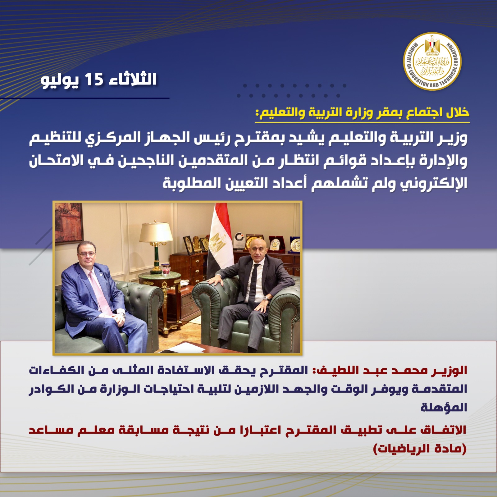 وقد أشاد السيد الوزير محمد عبد اللطيف بالمقترح، مؤكدًا أهميته في تحقيق الاستفادة المثلى من الكفاءات المتقدمة، وتوفير الوقت والجهد اللازمين لإجراء مسابقات جديدة عند ظهور احتياجات إضافية أو شواغر نتيجة عدم استكمال أحد المجتازين لإجراءات التعيين، كما أثنى الوزير على الطفرة التي حققها المهندس حاتم نبيل في ملف المسابقات، وخاصة فيما يتعلق بالسرعة المنضبطة التي تراعي أعلى معايير الدقة، والتي أصبحت تميز آليات التوظيف واختيار أفضل العناصر المؤهلة للعمل داخل المنظومة التعليمية.