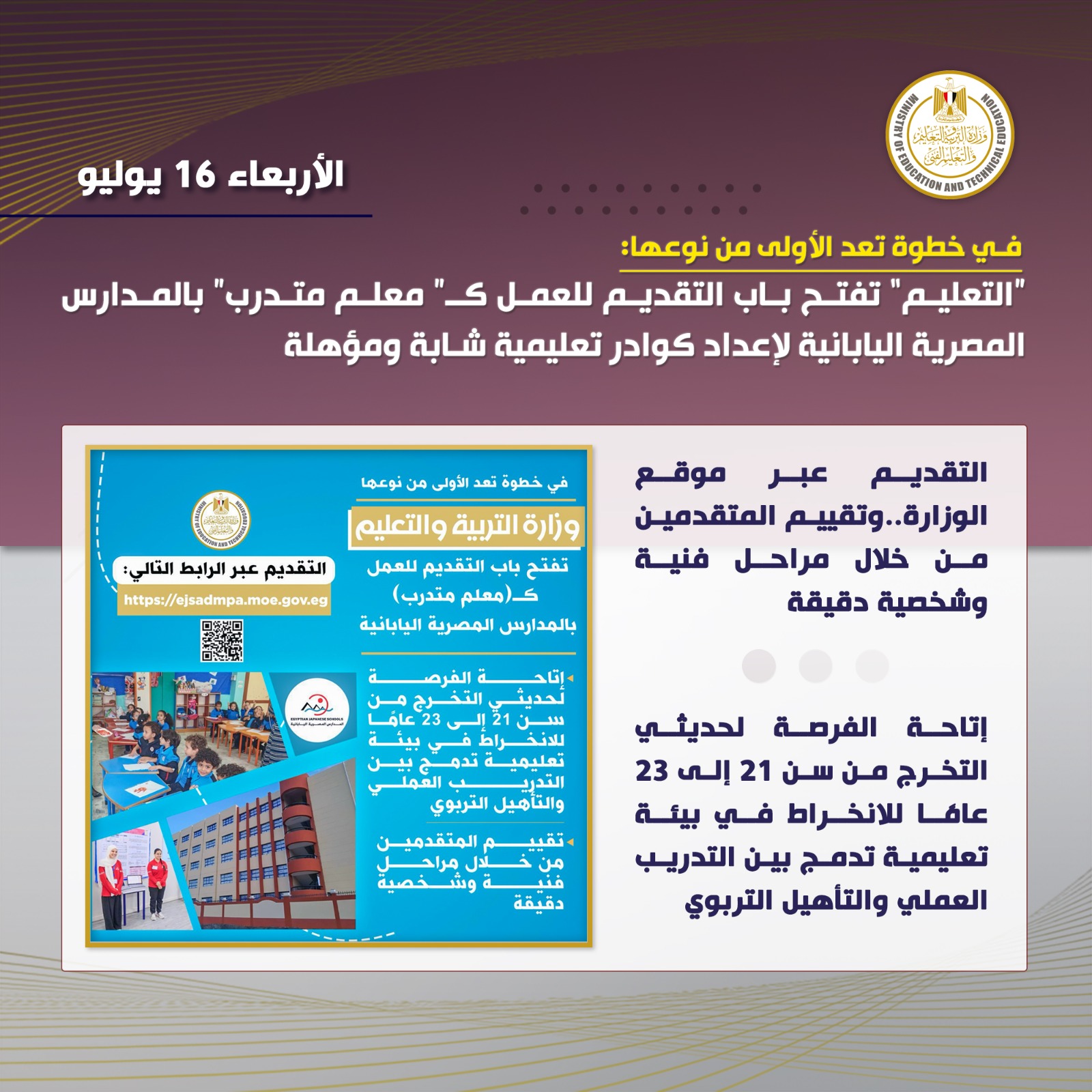 في خطوة تعد الأولى من نوعها ضمن جهود وزارة التربية والتعليم والتعليم الفني لتطوير المنظومة التعليمية وبناء قدرات المعلمين الشباب، تعلن وحدة المدارس المصرية اليابانية عن فتح باب التقديم للعمل كـ”معلم. متدرب” داخل المدارس المصرية اليابانية، وذلك لمدة لا تقل عن عام دراسي وحتى عامين.