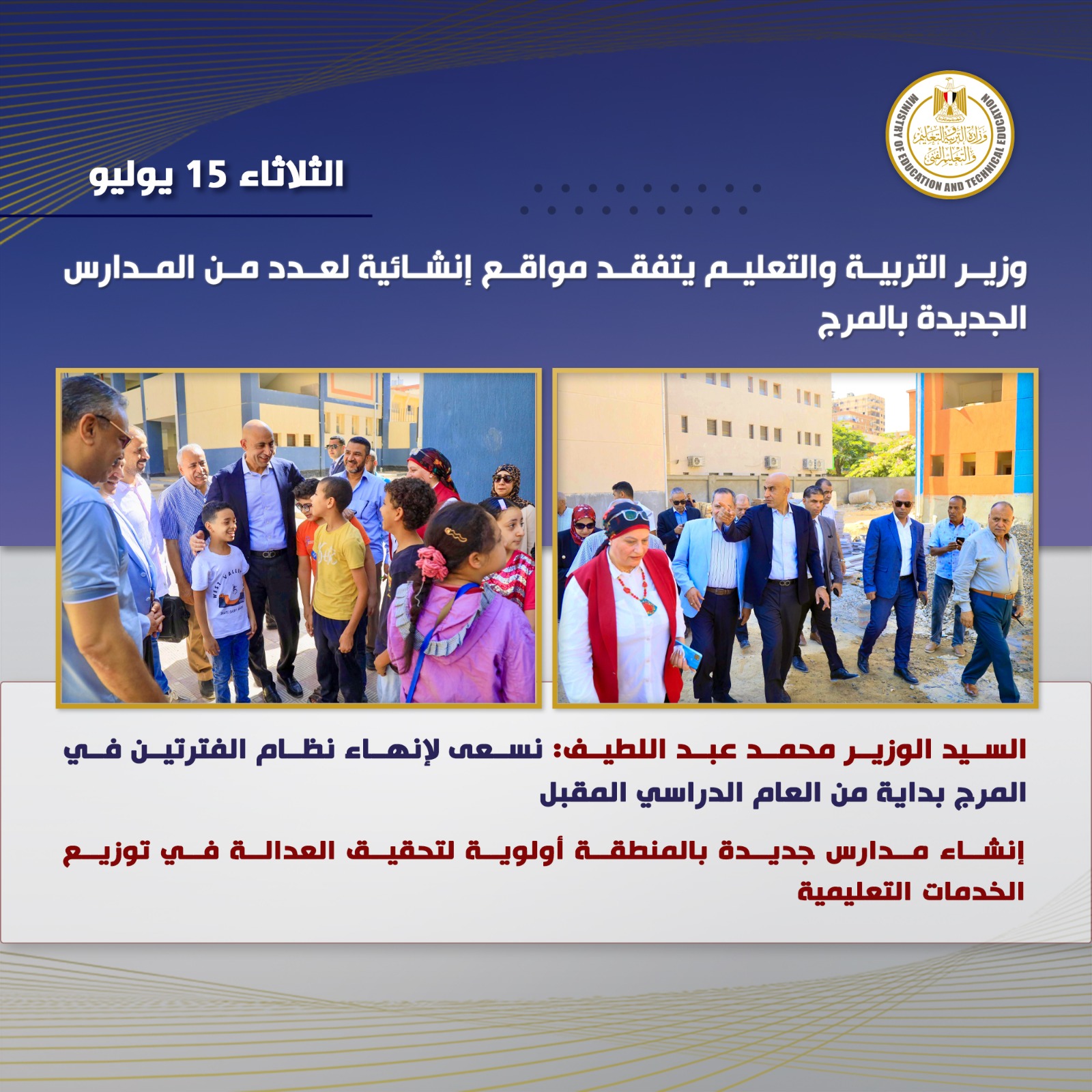 في إطار حرص وزارة التربية والتعليم على التوسع في أعداد المدارس بالمناطق ذات الكثافات الطلابية العالية وانهاء نظام الفترتين ببعض المناطق، قام السيد/ محمد عبداللطيف وزير التربية والتعليم والتعليم الفني، بجولة ميدانية تفقد خلالها عددًا من المواقع المخصصة لإنشاء مدارس جديدة في منطقة المرج بمحافظة القاهرة ، وذلك بهدف إنهاء نظام الفترتين بداية من العام الدراسي المقبل.