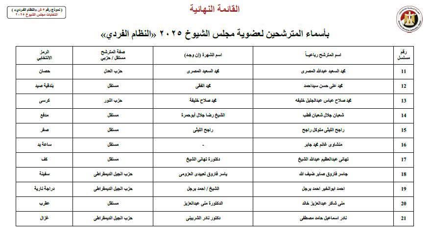 أعلنت الهيئة الوطنية للانتخابات، القائمة النهائية لأسماء المرشحين لعضوية مجلس الشيوخ 2025 بنظام الفردي بمحافظة البحيرة، وذلك بعد فحص طلبات الترشح ومراجعة الطعون، حيث بلغ إجمالي عدد المرشحين النهائيين 21 مرشحًا، يتنافسون على 6 مقاعد مخصصة للمحافظة.