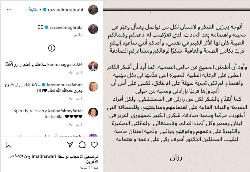 وكتبت رزان عبر صفحتها الرسمية "إنستجرام" "أتوجه بجزيل الشكر والامتنان لكل من تواصل وسأل وعبر عن محبته واهتمامه بعد الحادث الذي تعرضت له.