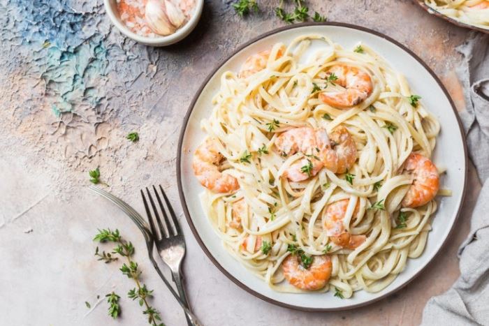يضاف الخليط إلى المكرونة الساخنة مباشرة ويقلب جيداً، وتوضع المكرونة بثمار البحر أو الفراخ المقطعة فى طبق التقديم، ترش الجبن المبشورة على وجه المكرونة وتزين بالريحان الطازج.