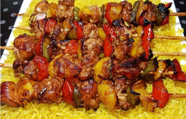 ثم تغرس كل قطعة من الدجاج بالتبادل مع قطعة من الخضروات ثم تشوى على الجريل الساخنة أو في طاسة من كل ناحية.