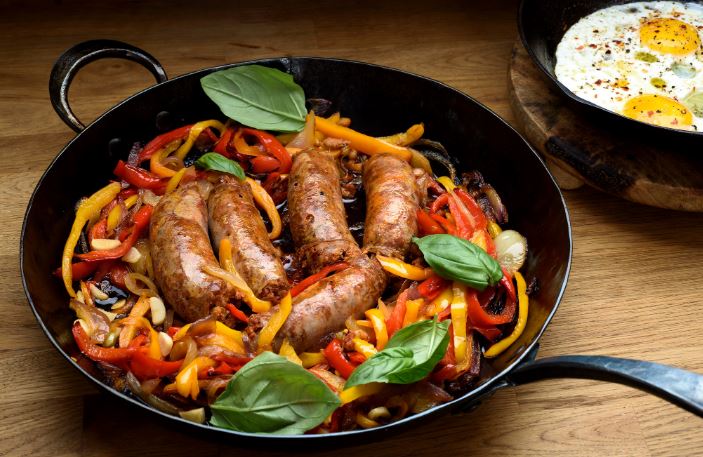 نضع الفلفل الرومى المقطع جوليان، والفلفل الأسود، والفراخ أو السى فود (على حسب الرغبة) ثم تقلب جيداً على نار هادئة لمدة 5 دقائق، وبعدها نترك المقلاة مغطاة جيداً على نار متوسطة لمدة 10 دقائق.