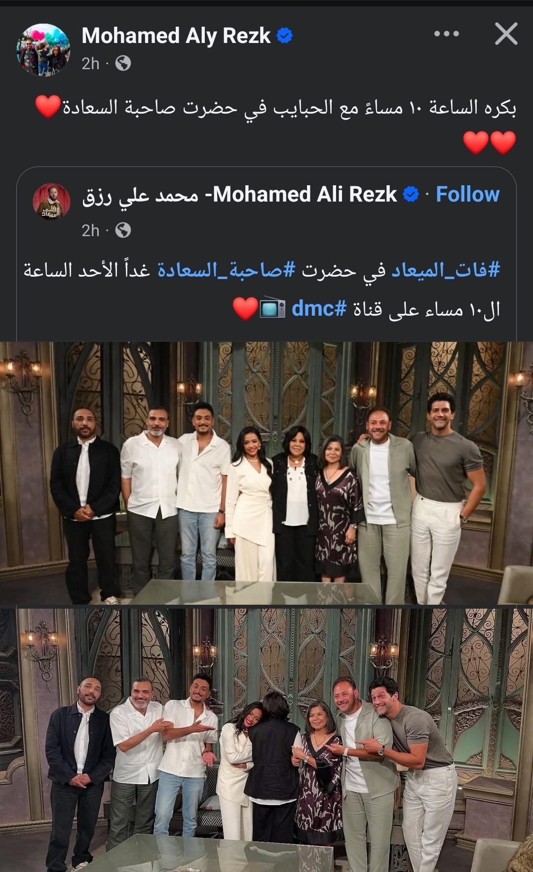 وكتب عبر حسابه الرسمي على موقع التواصل الاجتماعي لتبادل الصور والفيديوهات الانستجرام: “بكرة الساعة 10 مساء مع الحبايب في حضرة صاحبة السعادة”.