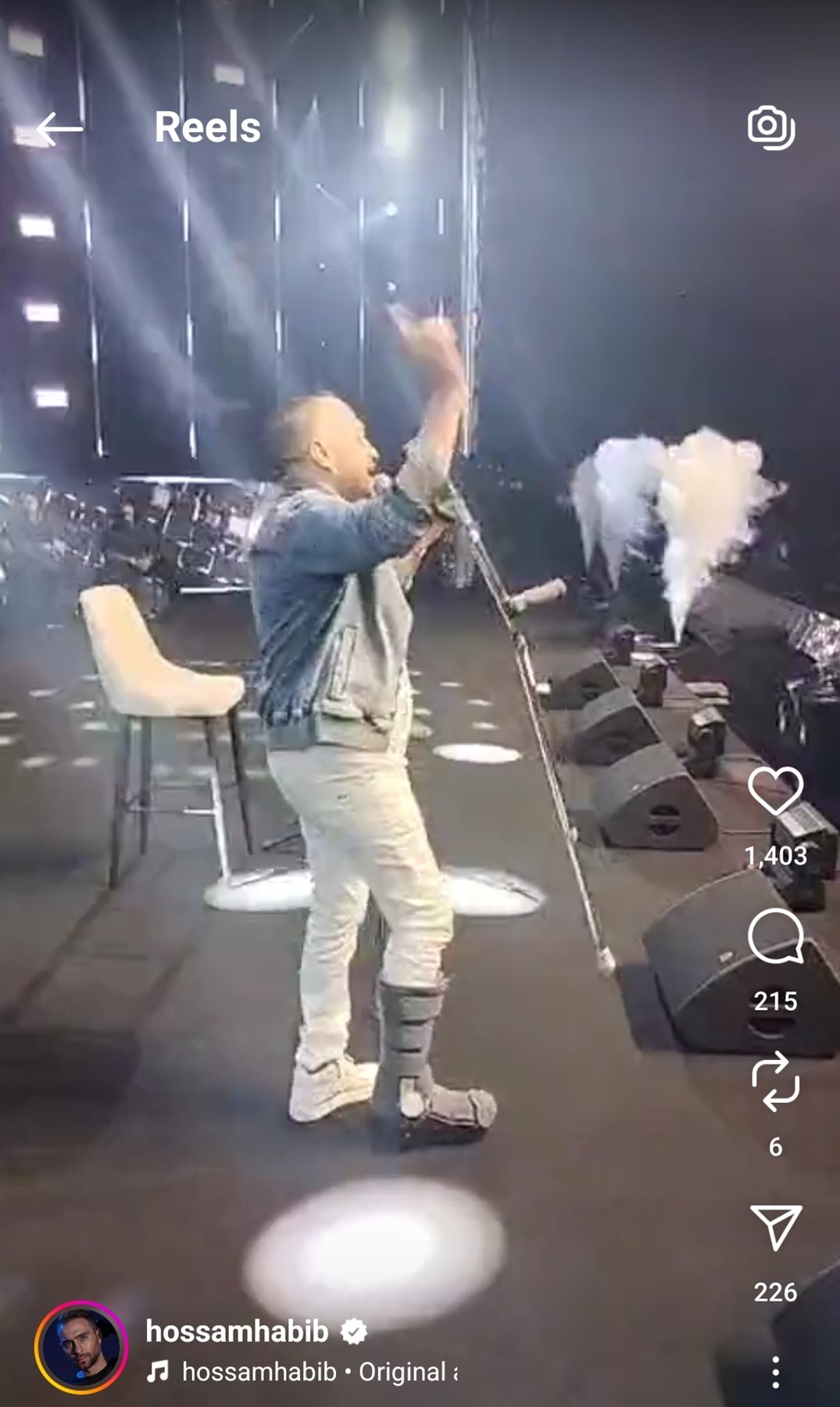 ظهر الفنان حسام حبيب وهو يرقص بعكازه ويحرك قدميه المصابة، وتحامله عليها خلال إحياءه حفلا بجده بالمملكة العربية السعودية، رغم إصابته بكسر في ساقه.