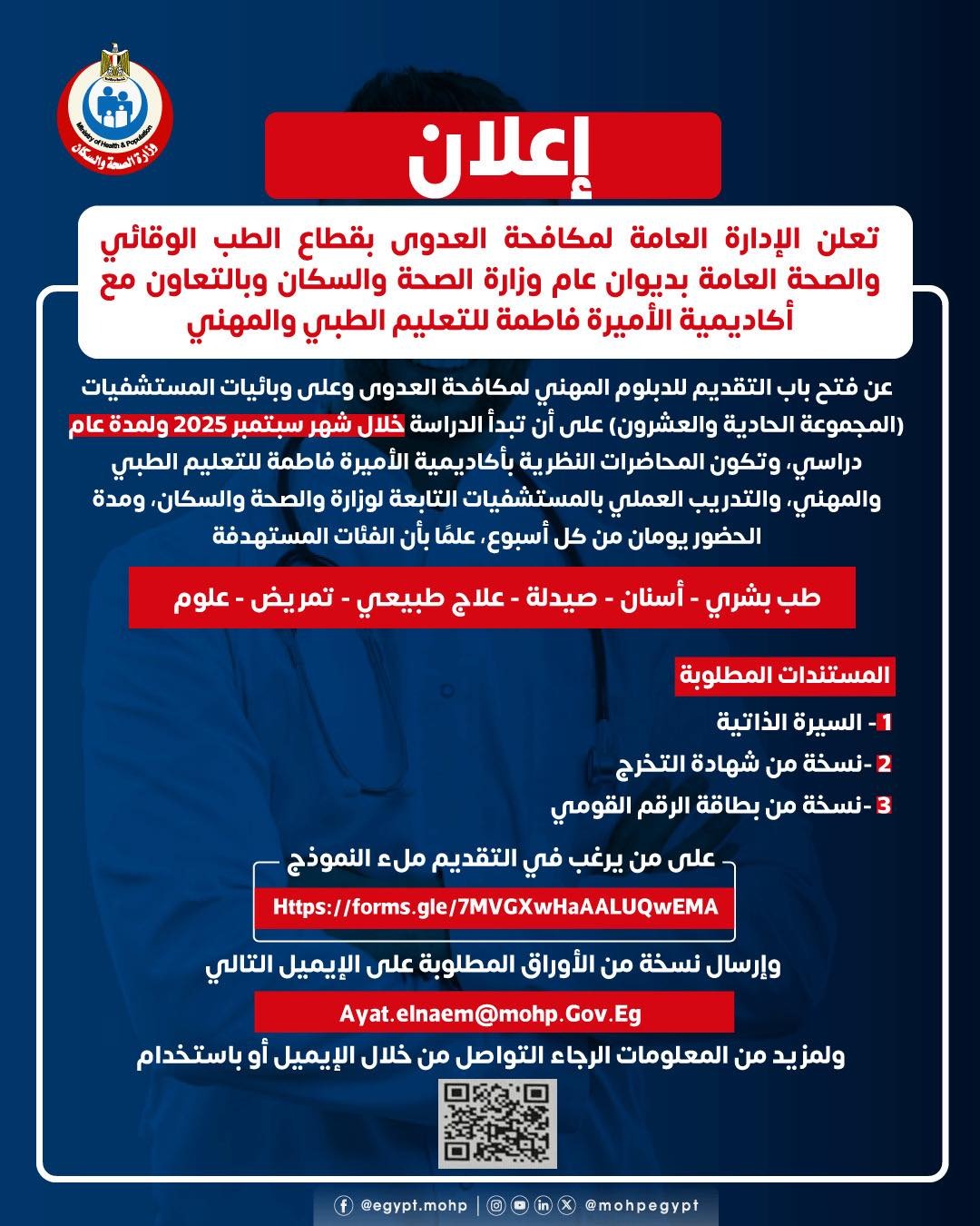 أعلنت الإدارة العامة لمكافحة العدوى بقطاع الطب الوقائي والصحة العامة بديوان عام وزارة الصحة والسكان وبالتعاون مع أكاديمية الأميرة فاطمة للتعليم الطبي والمهني عن فتح باب التقديم للدبلوم المهني لمكافحة العدوى وعلى وبائيات المستشفيات (المجموعة الحادية والعشرون).