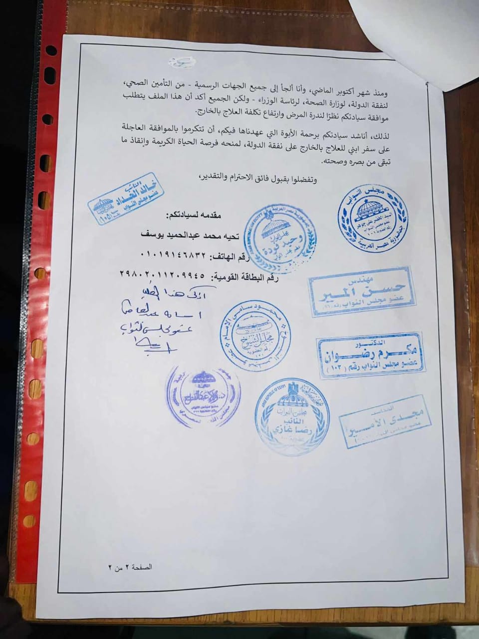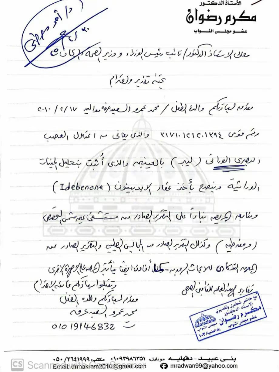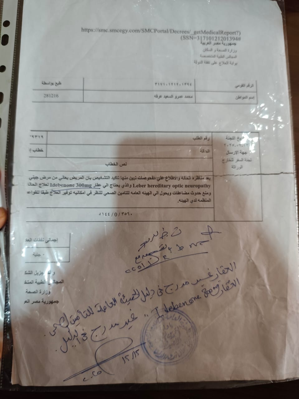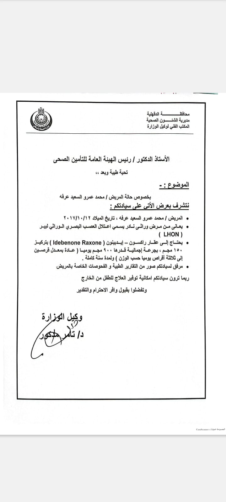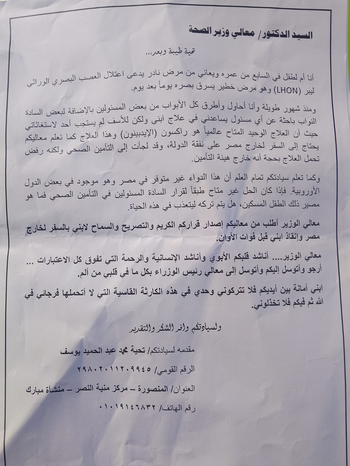 ومن ناحية أخرى أن العلاج المطلوب لمحمد لا يوجد بمصر ولكن متوفر بالخارج ولأن محمد منافع من التأمين الصحى لايعرف له العلاج المذكور لأنه خارج البروتوكول وأنه يلزم سفره للخارج.