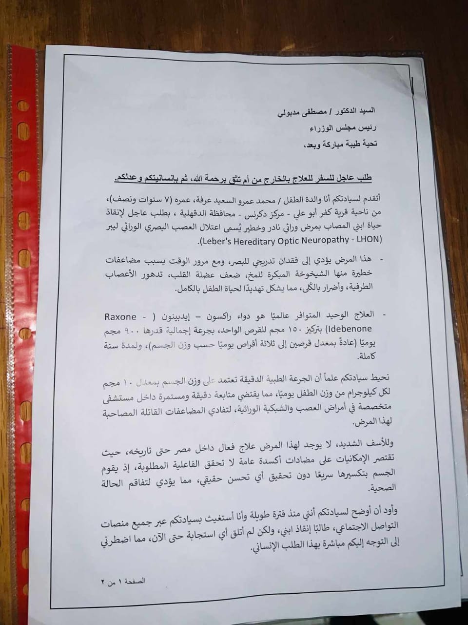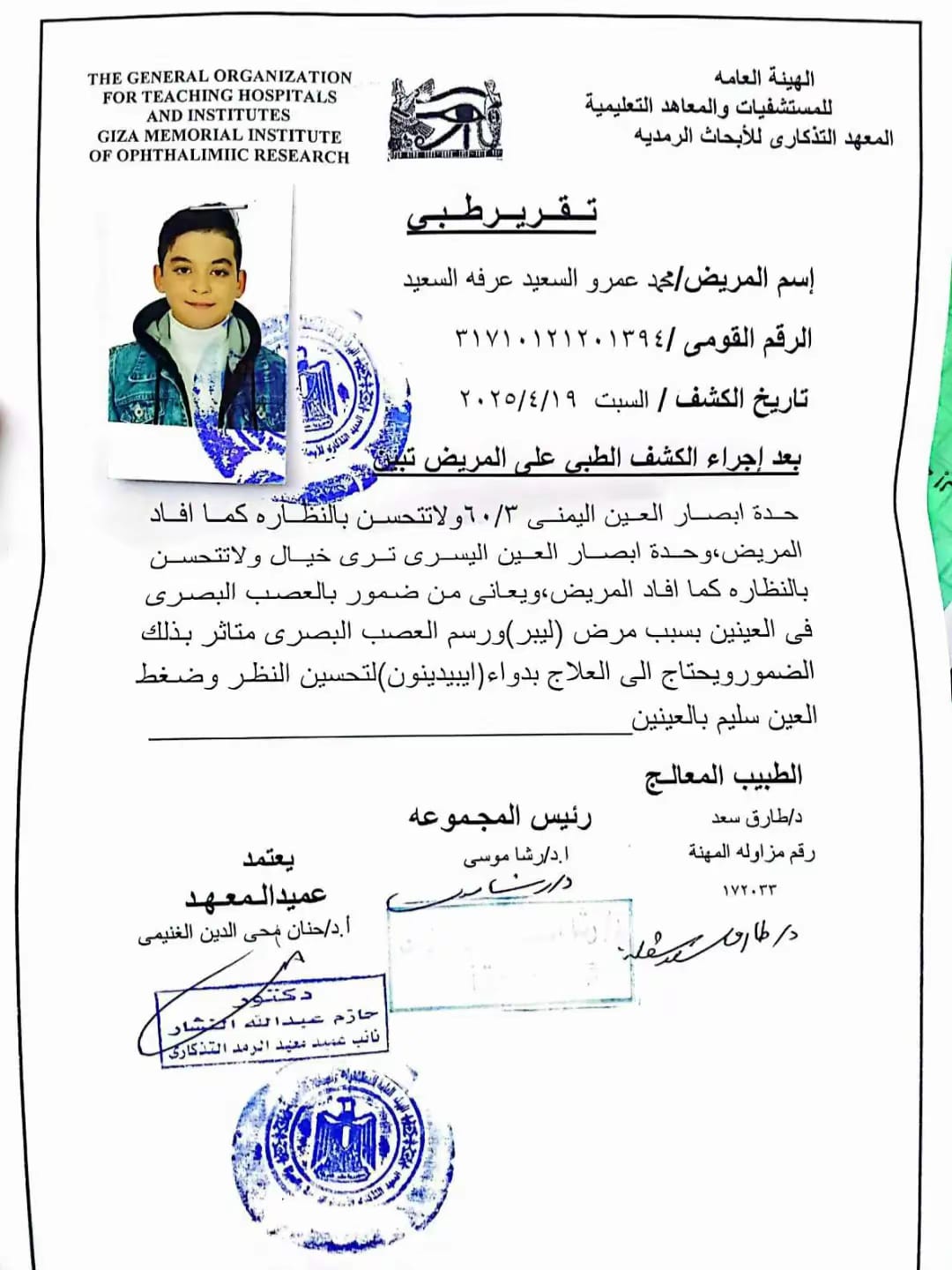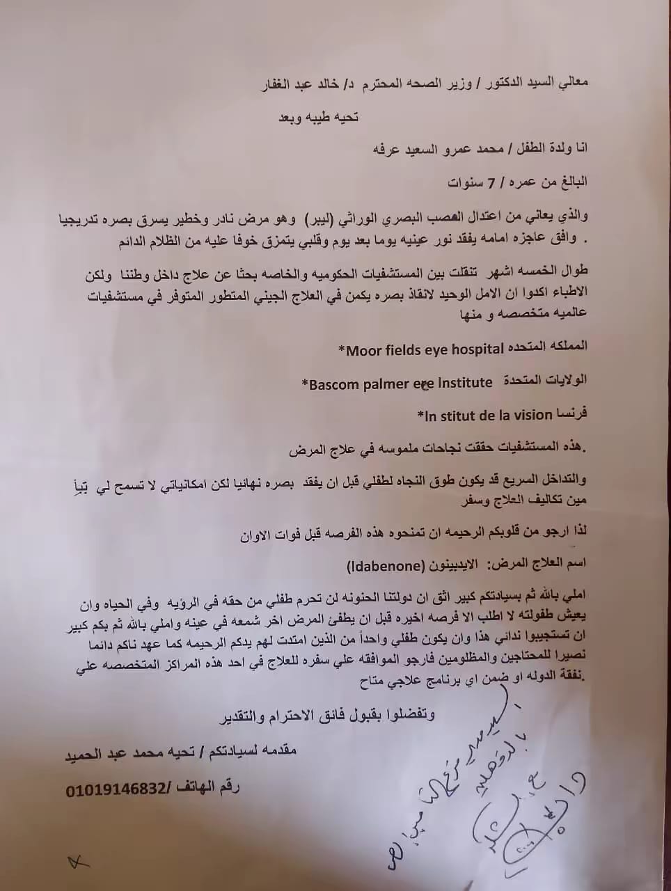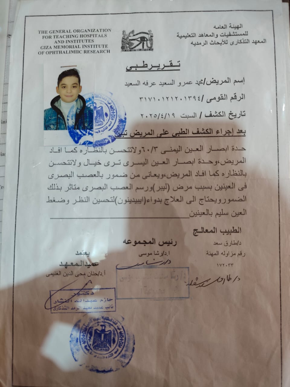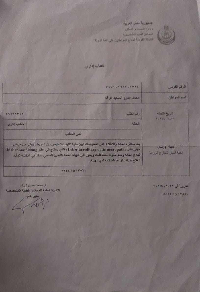 وبناءا على ما كشفته التقارير الطبية للطفل محمد عمرو الذى يبلغ من العمر ٨ سنوات حدة أبصار العين اليمنى ٣/ ٦٠ ولا تتحسن بالنظارة وحدة أبصار العين اليسرى ترى خيال ولا تتحسن بالنظارة ويعانى أيضا من ضمور بالغصب البصري فى العينين بسبب مرض( ليبر ) ورسم العصب البصري متاثر بذلك الضمور ويحتاج إلى العلاج بدواء ( ابيدينون ) لتحسين النظر.